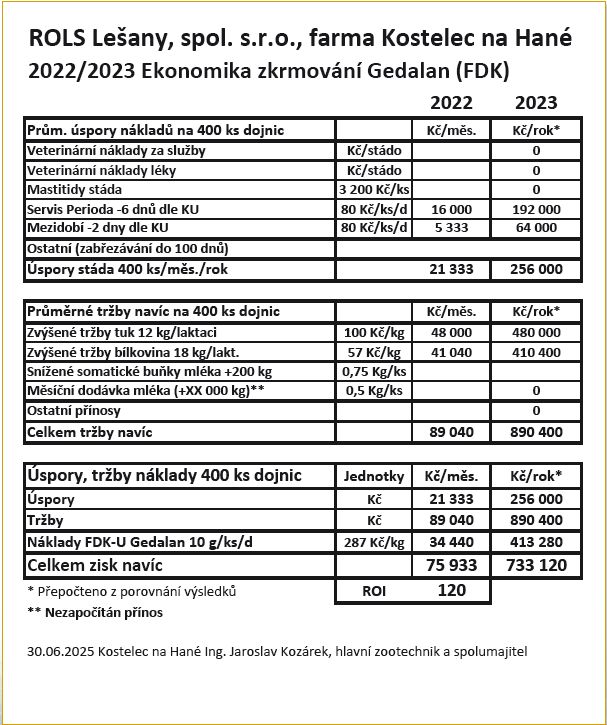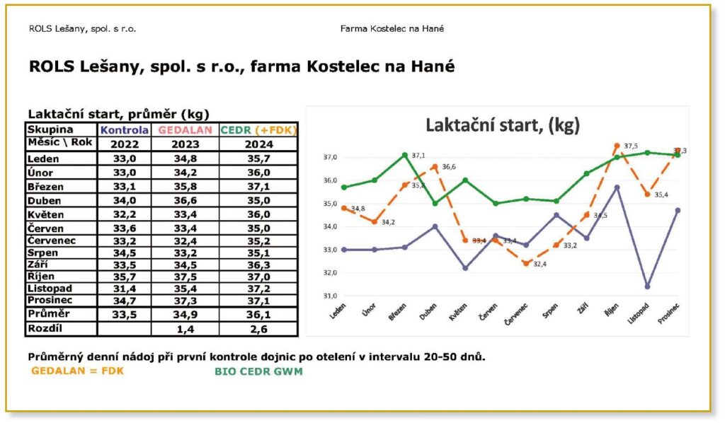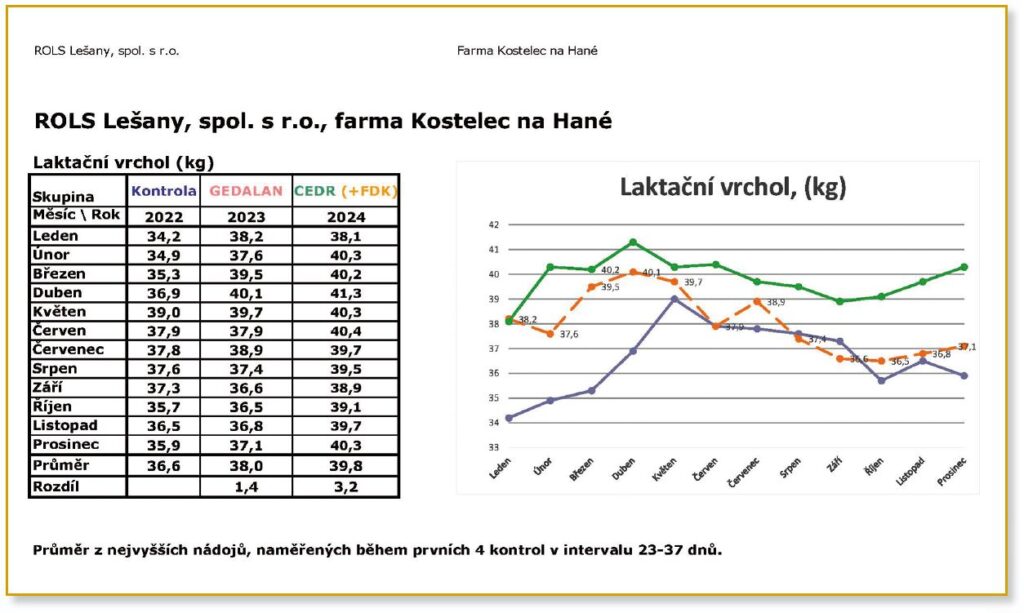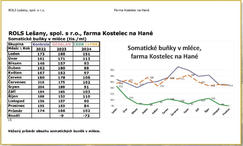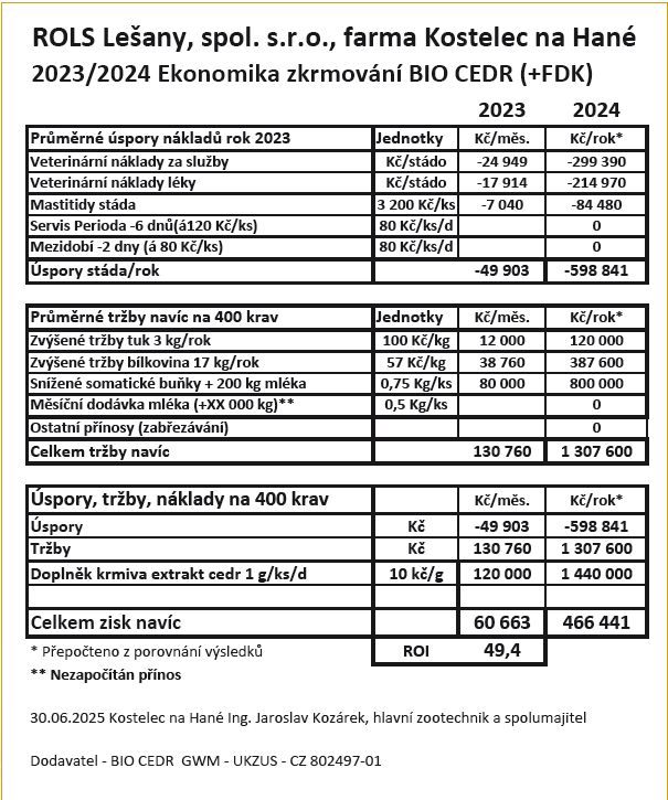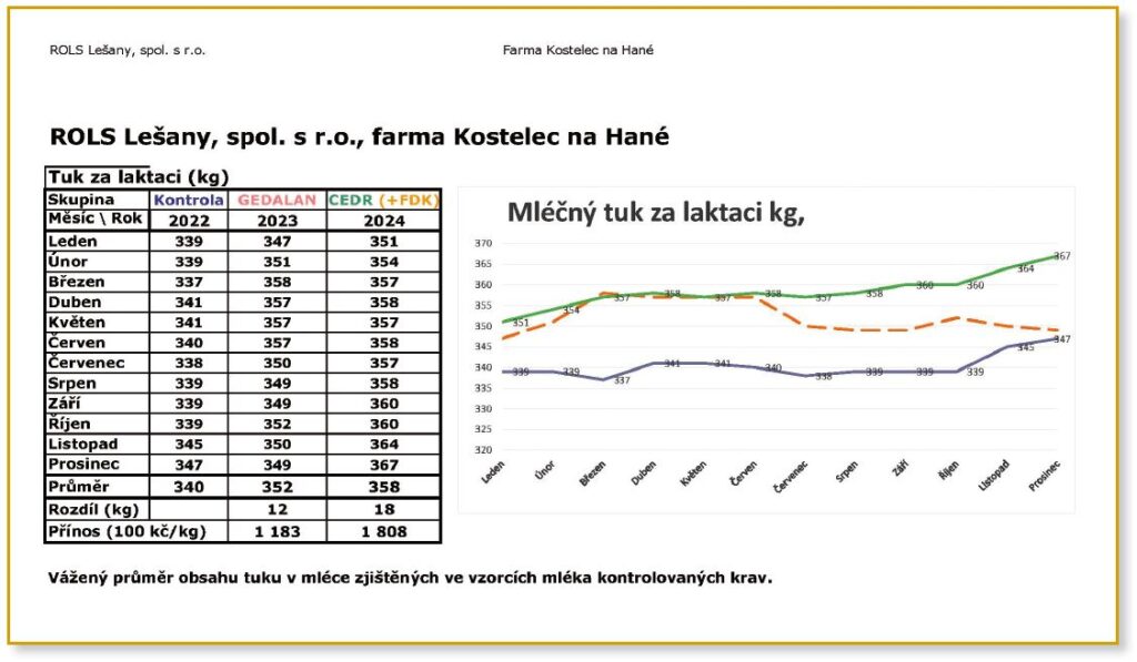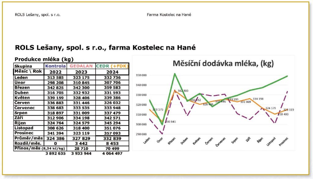Závěr: Studie je zaměřená pouze na dojivost, kvalitu mléka a zdraví stáda. Zkrmování doplňkových krmiv FDK U Gedalan 2023 s přidáním BIO CEDR GWM v roce 2024 má příznivý vliv na zdraví stáda dojnic a přináší značný ekonomický efekt +110 000 Kč měsíčně, tj. cca +1 350 000 Kč/rok/420 dojnic v průměru. Jedná se o farmu zaměřenou na produkci mléka a výrobu sýra. Nejsou zde zahrnuty další benefity a zisky, jako je přírůstek svaloviny, delikátní jemnost masa atd., které při zkrmování BIO CEDR GWM vznikají. V rámci dlouhodobého efektu se jedná o další finanční přínos s celkovým ziskem cca 135 000 až 140 000 Kč měsíčně, tj. cca +1 620 000–1 680 000 Kč/rok/420 dojnic v průměru.