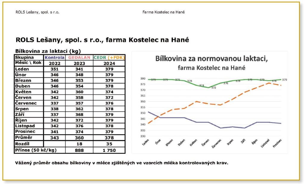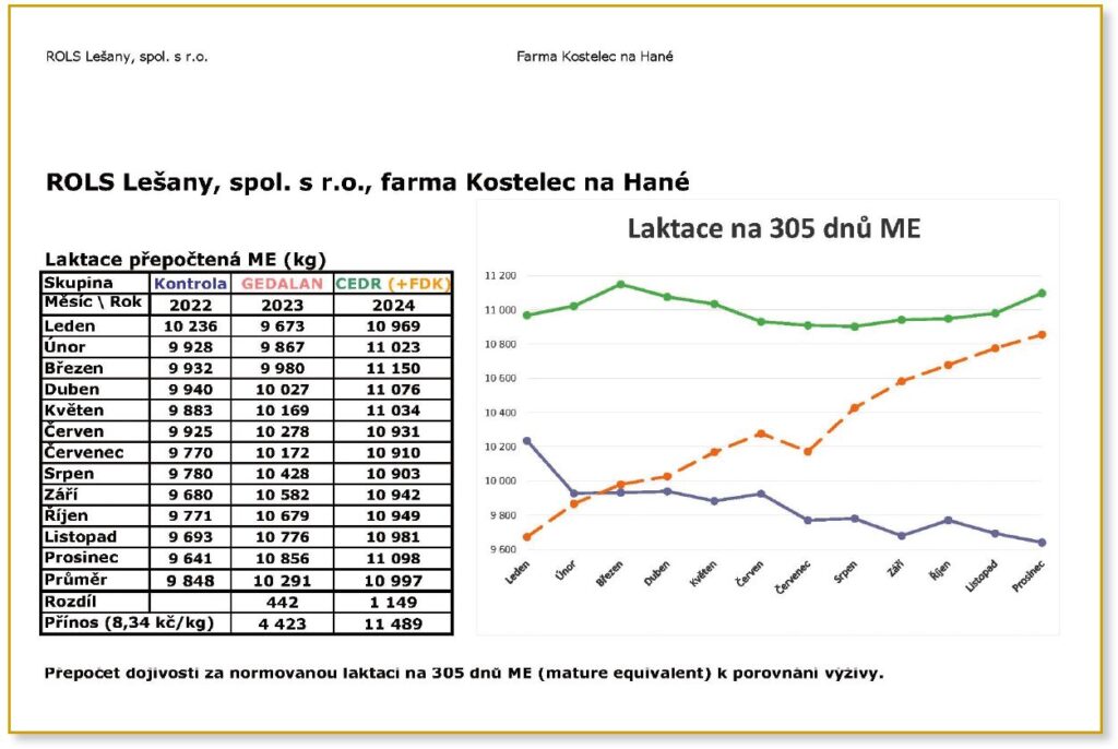 Průměrná užitkovost v roce 2023 byla 9800 kg (ME přepočteného mléka podle obsahu složek tuku a bílkovin mléka – viz graf č. 3). S FDK U Gedalan v roce 2023 – nárůst cca +440 kg mléka/ks/laktaci (cca +4440 Kč/ks/rok). Kombinace FDK + BIO CEDR GWM v roce – nárůst cca +1200 kg/ks/laktaci (tržby cca +12 000 Kč/ks/rok).